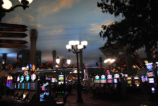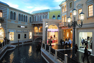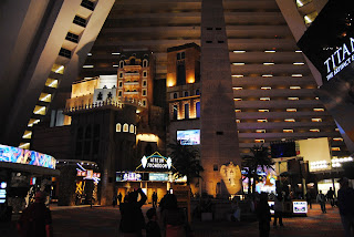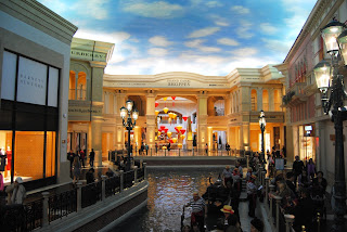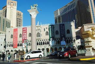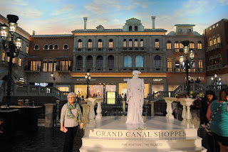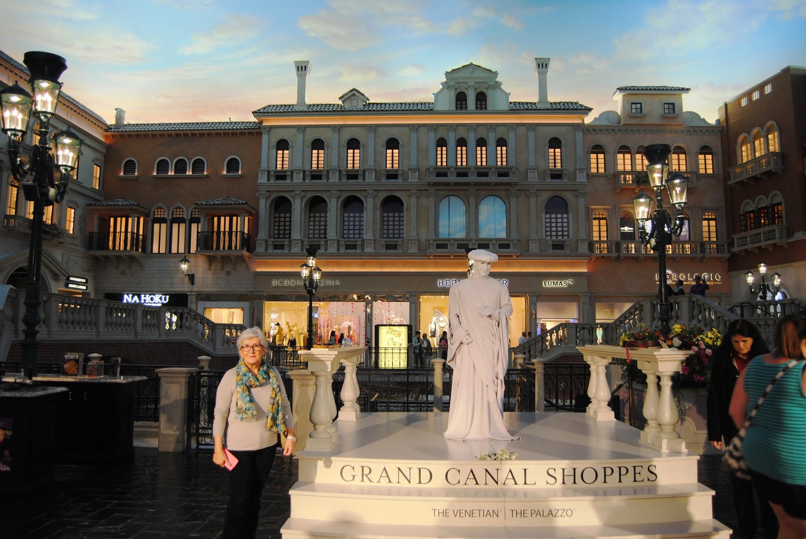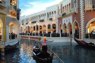 Otro de los casinos y hoteles más sorprendentes, puede que el que más, bajo mi modesta opinión, es el Palazzo Venetian, donde, además de su lujosa fachada donde se reproduce el palacio del Duce veneciano, encontrarás su inmensidad interior, te sorprenderá una reproducción de los canales venecianos a tamaño real, con agua y gondoleros que cantan sus barcarolas mientras reman y pasean al cliente. El cielo artificial, pintado sobre el inmenso techo que cubre la explanada y las calles con canales, es impresionante y te da la sensación de estar al aire libre. Grupos de gente ataviada a la usanza carnavalesca veneciana se pasean por la zona para amenizar el espectáculo mientras suben a escenarios cantando sus típicas canciones. Comercios, restaurantes, salas de juego, etc. son acogidas por los locales, que circundan los canales, ofertando sus servicios. Canal, góndola, “gondoliere”, remos y canto de barcarolas conforman un espectáculo inolvidable que te arrastra hasta la Venecia verdadera y te trae al recuerdo sus canales, calles, plazas y palacios. Solo faltó ver la plaza de San Marcos con su campanile y la fachada de la catedral y el puente de los suspiros tan afamado en Venecia, que une el Palacio Ducal con la antigua prisión de la Inquisición (Piombi), cruzando el Rio Di Palazzo.