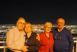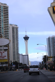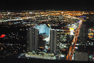 La vista de la ciudad es espléndida. La toma de tierra del avión ofreció una imagen iluminada como un ascua en la negra noche del desierto, a la par que el realce de los grandes edificios que acogen los casinos casi al mismo  lado del aeropuerto. Extensa sábana de polícroma luz que completa la orografía de la ciudad. De día cambia la visión y se presenta impresionante, con calles y edificios caprichosos que pretenden simular otros lugares: rascacielos de Nueva York, la Estatua de la Libertad, la torre Eiffel, una gran pirámide de Egipto, etc… unidos por un tren aéreo que circunda la zona… al fondo una inmensa torre reta al horizonte, es la torre Stratosphere de 350 metros de altura, el mayor reclamo de su propio casino. En su cúpula un restaurante giratorio, donde cenamos viendo el espectáculo desde arriba de la ciudad iluminada mientras, muy lentamente, el restaurante giraba para ofrecer una panorámica total del paisaje.  Sobre él un parque de atracciones que lanza sus cabinas al aire retando al inmenso vacío, donde solo los valientes dominan el vértigo del abismo.