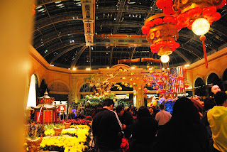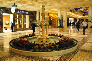 El Bellagio, junto a otro grande, como el Caesars Palace, ofrece a su entrada un espectáculo de luz, agua y sonido esplendoroso. Suena la música y la fuente lanza sus chorros de agua danzando al ritmo armonioso de la melodía, a veces con la furia del allegro y otras con el sosiego del adagio, mientras alrededor se agolpa un tumulto de gente ávida de presenciarlo. En su interior, adornado y decorado con sorprendente colorido y figuraciones, encuentras también, la inmensidad de sus salas de juego y de las no menos extensas instalaciones del Cirque du Soleil que ofrece variados espectáculos (nosotros vimos el O2) que requieren sacar las entradas con antelación para no quedarte sin verlos. Solo con pasear por sus galerías y las salas de juego acabas inmerso en otro mundo de sorpresa y embeleso, pues la gran cantidad de estímulos que percibes te lleva a la abstracción y a la pérdida del sentido del tiempo.