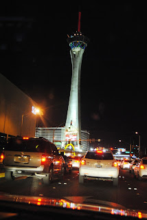 La cena, como he dicho, en el restaurante giratorio de la torre Stratosphere, pero no muy elevado (el precio, claro, la torre a 350 metros de altura permitía una vista panorámica increíble), aunque para una vez que vas, si te es posible, no te mires el bolsillo. Una cena ligera, para evitar dolores de cartera, te permitirá cumplir una vuelta completa cenando mientras giras. Abajo los juegos de luces de las calles, edificios y las plazas muestran su esplendor como un mundo mágico de luz. En plena cena observamos con sorpresa como una cabina saltaba hacia el vacío dando la sensación de desprenderse volando hacia el abismo, más solo era una ficción, pues volvió a su lugar una vez cumplida la sorpresa. El pequeño parque de atracciones, montado sobre la elevación de la torre, seguía funcionando y desafiando a los valientes que se atrevieran a enfrentarse al insondable precipicio. Yo en ningún momento pensé aceptar el reto.  Me vino a la memoria la otra torre donde hace años, allá por 2010, cenamos en las cataratas del Niágara, la torre Skylon, algo más baja, pero con vistas no menos estimulantes.